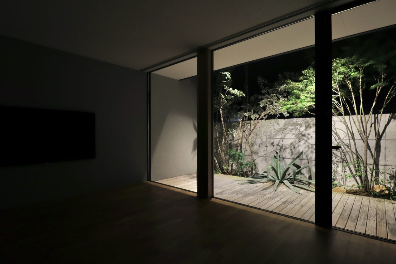 夜も庭園を愉しめる。太陽の光を再現する為に光は頭上から落とした。光源は隠しているので眩しくなく、庭園を綺麗に見せることができる。