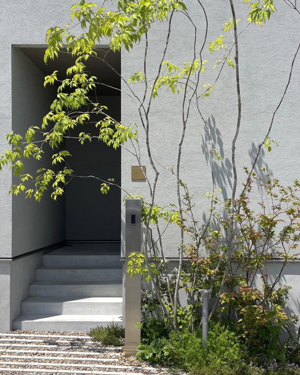 玄関はシンプルに仕上げて植栽が映えるように設計をした。