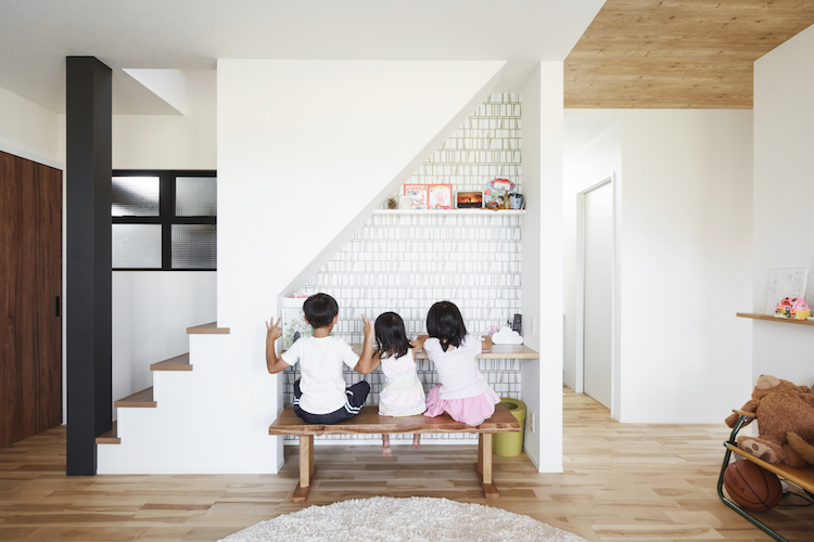 リビングの階段下を利用したデスクコーナーは家族共有の空間。