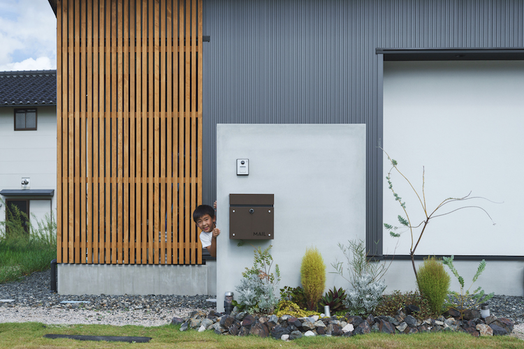 塗り壁、モルタル、木の仕上げが植栽とマッチして素材感のある雰囲気を作り上げています。