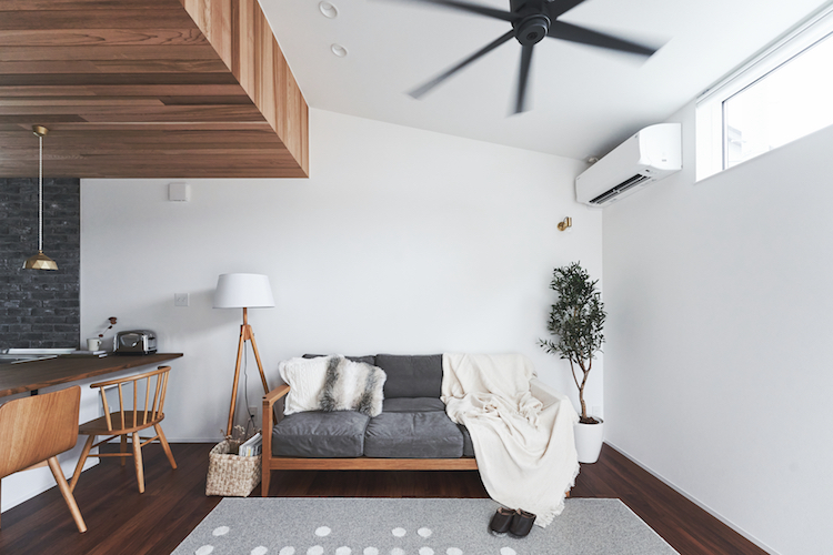 リビングの天井は下屋を利用した勾配天井。