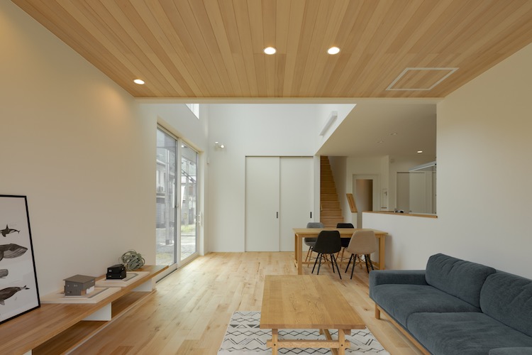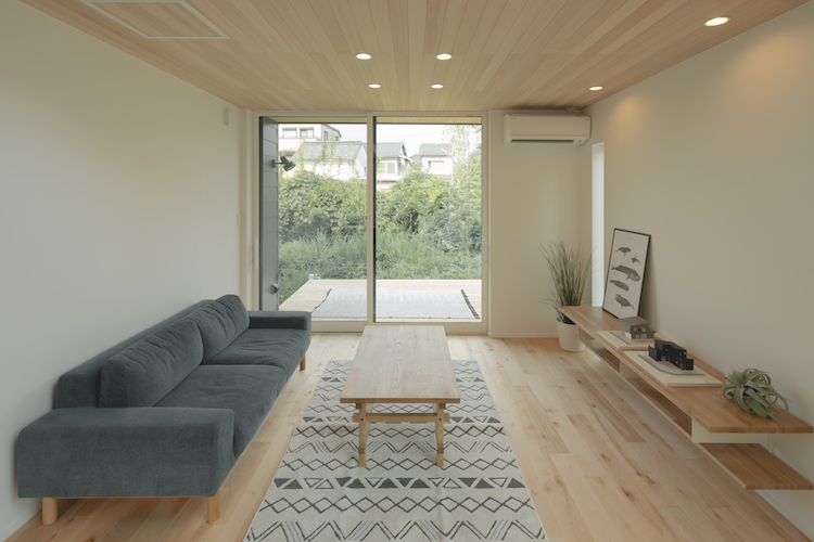 室内は外観からは想像できないような解放感に溢れ、中と外の境目を曖昧にしたリビングではついついゴロンと寝転びたくなります。