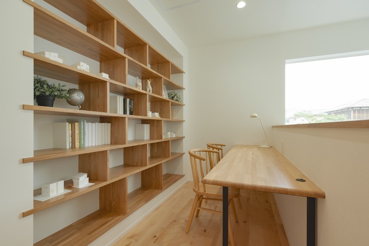 仕事柄、本や書類が多いご主人のために書斎には造作棚をつくりました。