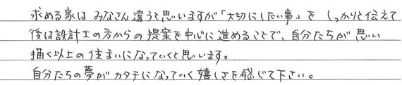 舞鶴市 K様 スタジオでの打ち合わせから引渡しまでのすべてが大切な思い出。 Q レクサスホームで建てようと思った決め手を教えてください。 A Q レクサスホームで家を建てて良かったと思うことは何ですか? A Q 家づくりを進めていく中で、思い出に残ったことは何ですか? A Q 実際にお住まいになられていかがですか? A Q これから家づくりを始められる方に一言アドバイスをお願いいたします。 A