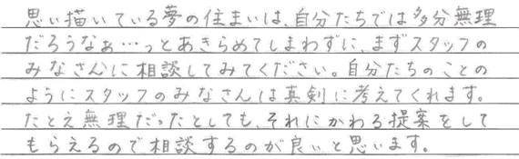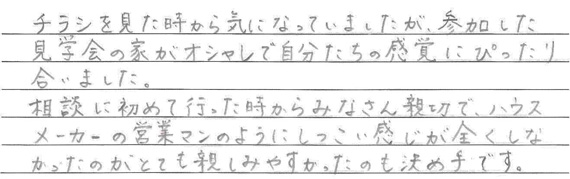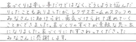 福知山市 Y様 オシャレで自分たち好みの家を建てることができました。 Q レクサスホームで建てようと思った決め手を教えてください。 A Q レクサスホームで家を建てて良かったと思うことは何ですか? A Q 家づくりを進めていく中で、思い出に残ったことは何ですか? A Q 実際にお住まいになられていかがですか? A Q これから家づくりを始められるかたに一言アドバイスをお願いいたします。 A