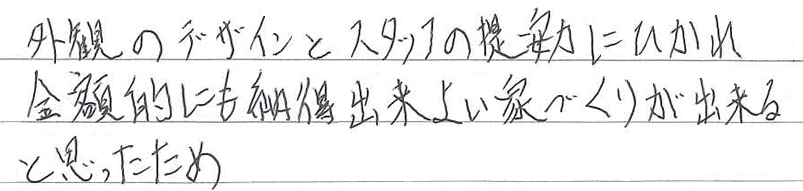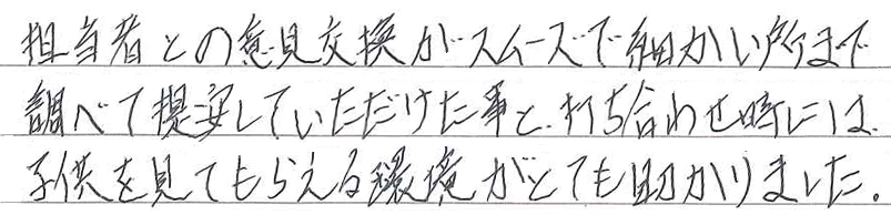 福知山市 S様 保育担当の方がおられるので、打合せ時に子どもを安心してお任せできとても助かりました。 Q 家づくりでどういうことを重視されましたか? A Q レクサスホームで建てようと思った決め手を教えてください。 A Q 家づくりを進めていく中で、思い出に残ったことは何ですか? A Q 実際にお住まいになられていかがですか? A Q レクサスホームで家を建てて良かったと思うことは何ですか? A Q ここをもっとこうしておけば・・・と思われることはありますか? A Q これから家づくりを始められるかたに一言アドバイスをお願いいたします。 A