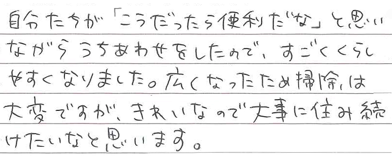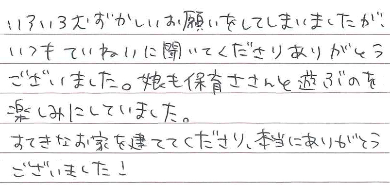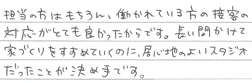 丹波市 H様 居心地のよいスタジオでの家づくりはとても快適でした! Q 家づくりでどういうことを重視されましたか? A Q レクサスホームで建てようと思った決め手を教えてください。 A Q 家づくりを進めていく中で、思い出に残ったことは何ですか? A Q 実際にお住まいになられていかがですか? A Q レクサスホームで家を建てて良かったと思うことは何ですか? A Q ここをもっとこうしておけば・・・と思われることはありますか? A Q これから家づくりを始められるかたに一言アドバイスをお願いいたします。 A