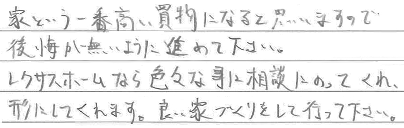 丹波市 H様 平屋希望のコンセプトに、想像以上の設計提案で大満足! Q 家づくりでどういうことを重視されましたか? A Q レクサスホームで建てようと思った決め手を教えてください。 A Q レクサスホームで家を建てて良かったと思うことは何ですか? A Q 実際にお住まいになられていかがですか? A Q これから家づくりを始められるかたに一言アドバイスをお願いいたします。 A