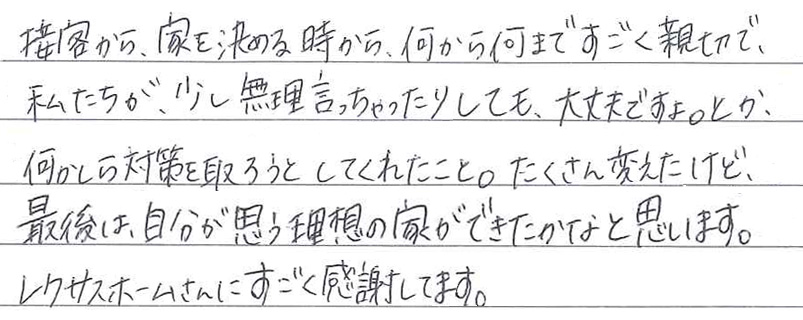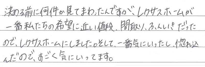 綾部市 N様 惚れこんで決めたレクサスホーム!住んでも大満足です! Q レクサスホームで建てようと思った決め手を教えてください。 A Q 家づくりを進めていく中で、思い出に残ったことは何ですか? A Q 実際にお住まいになられていかがですか? A Q レクサスホームで家を建てて良かったと思うことは何ですか? A Q これから家づくりを始められるかたに一言アドバイスをお願いいたします。 A