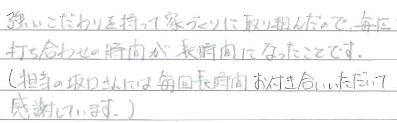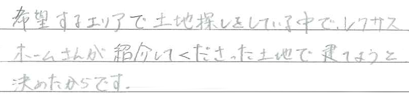 福知山市 T様 自分たちのこだわりのある、オシャレな家が実現しました。 Q 家づくりでどういうことを重視されましたか? A Q レクサスホームで建てようと思った決め手を教えてください。 A Q 家づくりを進めていく中で、思い出に残ったことは何ですか? A Q 実際にお住まいになられていかがですか? A Q レクサスホームで家を建てて良かったと思うことは何ですか? A Q ここをもっとこうしておけば・・・と思われることはありますか? A Q これから家づくりを始められるかたに一言アドバイスをお願いいたします。 A
