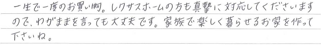 福知山市 H様 設計士さんと直接相談ができたので、自分たちの意見もしっかりと伝わり、素敵な住まいづくりができました。 Q 家づくりでどういうことを重視されましたか? A Q 家づくりを進めていく中で、思い出に残ったことは何ですか? A Q 実際にお住まいになられていかがですか? A Q レクサスホームで家を建てて良かったと思うことは何ですか? A Q これから家づくりを始められるかたに一言アドバイスをお願いいたします。 A