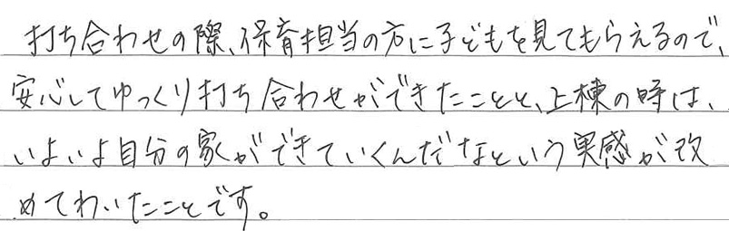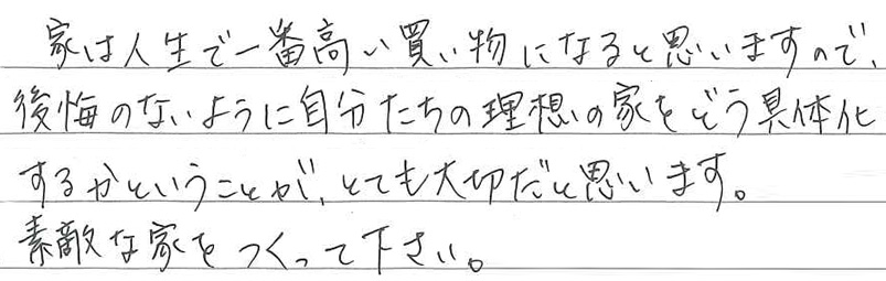 舞鶴市 Y邸 設計士の方と直接相談ができ、保育士の方がおられるので、安心して打ち合わせができました! Q 家づくりでどういうことを重視されましたか? A Q レクサスホームで建てようと思った決め手を教えてください。 A Q 家づくりを進めていく中で、思い出に残ったことは何ですか? A Q 実際にお住まいになられていかがですか? A Q レクサスホームで家を建てて良かったと思うことは何ですか? A Q ここをもっとこうしておけば・・・と思われることはありますか? A Q これから家づくりを始められるかたに一言アドバイスをお願いいたします。 A